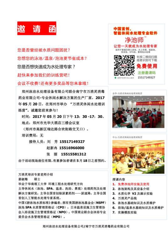了解更多+鄭州泳潔水處理設(shè)備有限公司聯(lián)合南寧萬(wàn)消靈消毒藥業(yè)有限公司-專業(yè)休閑水解決方案的生產(chǎn)廠家,2017年05月20日(這周六),在鄭州市舉辦“萬(wàn)消靈休閑水處理訓(xùn)練營(yíng)”,誠(chéng)邀您前來(lái)參與!