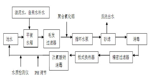 本設計泳池的進回水方式,采用淺水端池壁進水、深水端池底回水和池面排水相結合的順流循環方式,采用這種方式,既能有效去除沉積于底部的污物,又可去除浮于水面的毛發及其它輕質漂浮物。保證了全池水質的均勻。工藝流程圖如下圖所示: