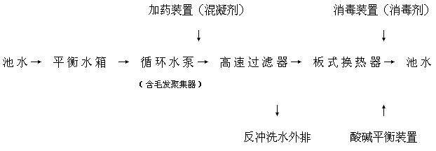 泳池回水從主回水格柵先經(jīng)毛發(fā)聚集器,循環(huán)泵將水中毛發(fā)、大的懸浮物截留住,以免毛發(fā)纏繞泵的葉輪,影響后繼設備運行。出水加入混凝劑后,在管道內(nèi)發(fā)生混合反應,將水中微小懸浮物凝聚,產(chǎn)生花經(jīng)高速過濾器后襯過濾截留。后經(jīng)過換熱器,池水部分加熱后,與另一部分混合。此時加入消毒劑,以殺滅水中細菌,保持一定的余氯量,并加入除藻劑,避免池水發(fā)綠,并調(diào)節(jié)PH值,然后池水重新回到泳池。以上是成熟的游泳池循環(huán)水處理工藝。