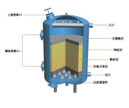4、按濾料的組合可分為三種:①單層濾料(以石英砂、硅藻土等單一的濾料為主) ;②雙層濾料(由石英砂與無煙煤兩種濾料組合);③三層濾料(由石英砂、無煙煤、沸石或鐵礦砂組合)。
