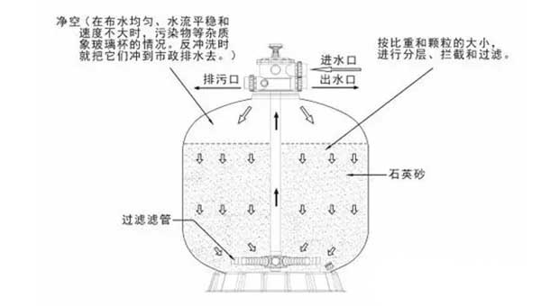 石英砂過濾器的作用是通過過濾介質把池水中的污染雜質、膠狀或顆粒狀有機物進行截留和吸附,把池水變得澄清透明,最后才進入加熱殺毒的環節,以達到水質標準再生利用。