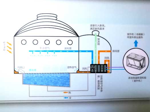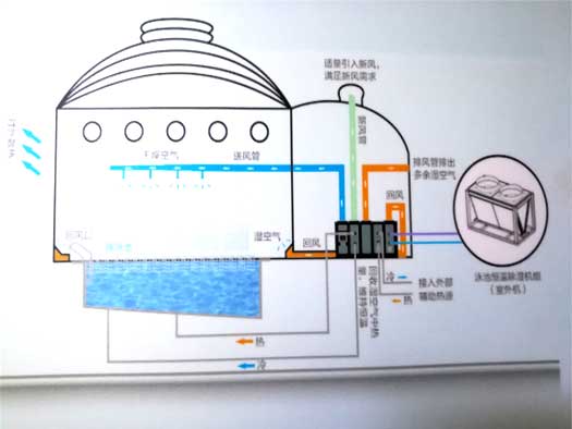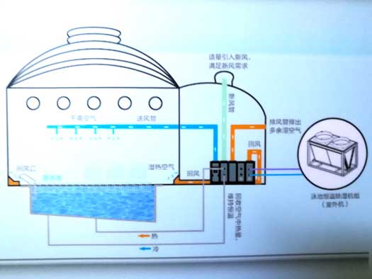 在夏季,需要進行空氣冷卻時,制冷劑就繞過再加熱盤管和池水冷凝器流向外機冷凝器,讓來自蒸發器的冷空氣給室內游泳館提供干燥涼爽的空氣環境。