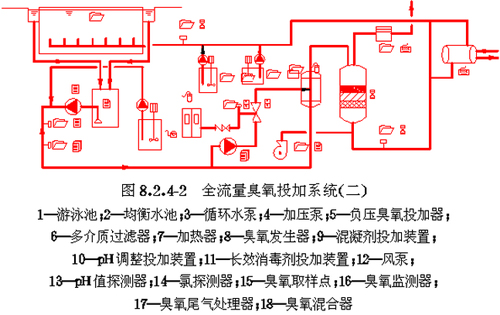 (1)世界級、國家級競賽游泳池及池水衛生要求很高、人數負荷高的游泳池和水上游樂池,宜采用循環水過濾與殘余臭氧吸附過濾分開設置的循環水全部進行消毒的全流量臭氧消毒系統。