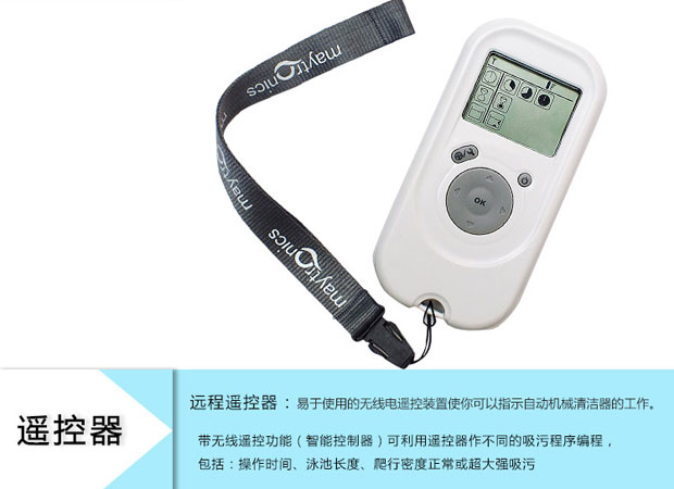 2、可利用遙控器作不同的吸污程序編程,包括:操作時(shí)間、泳池長(zhǎng)度、爬行密度正常或超大強(qiáng)吸污等等。